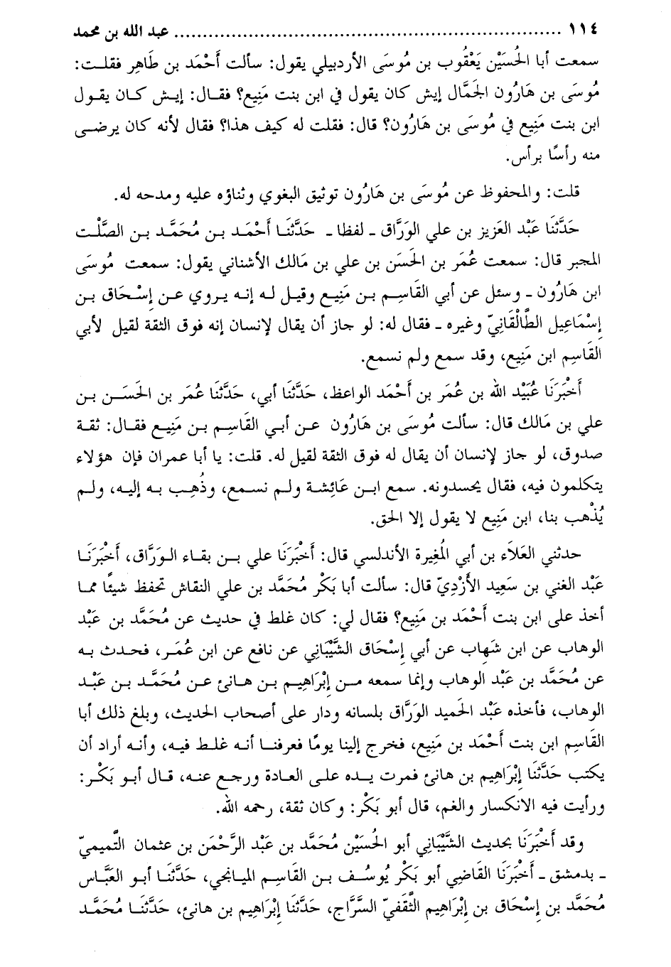 حَدَّثَنِي العلاء بْن أَبِي المغيرة الأندلسي قَالَ: أَخْبَرَنَا علي بن بقاء الوراق، أَخْبَرَنَا عبد الغني بن سعيد الأزدي قَالَ: سألت أبا بكر مُحَمَّد بن علي النقاش تَحفظ شيئًا مِمَّا أخذ على ابن بنت أَحْمَد بن منيع؟ فقَالَ لي: كان غلط في حديث عن محمّد بن عبد الوهاب عن ابن شهاب عن أبي إسحاق الشيباني عن نافع عن ابن عمر، فحدث به عن مُحَمَّد بن عبد الوهاب وإنما سمعه من إِبْرَاهِيم بن هانئ عن مُحَمَّد بن عبد الوهاب، فأخذه عبد الحميد الوراق بلسانه ودار على أصحاب الحديث، وبلغ ذلك أبا القاسم ابن بنت أَحْمَد بن منيع، فخرج إلينا يومًا فعرفنا أنه غلط فيه، وأنه أراد أن يكتب حَدَّثَنَا إِبْرَاهِيم بن هانئ فمرت يده على العادة ورجع عنه، قَالَ أبو بكر: