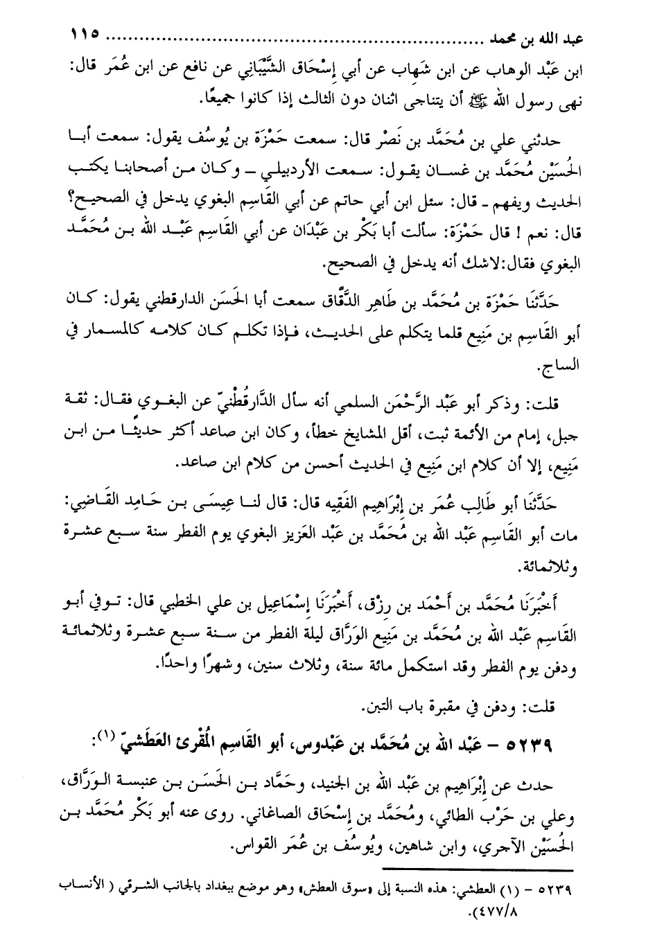 [1] 5239 العطشي: هذه النسبة إلى «سوق العطش» وهو موضع ببغداد بالجانب الشرقي (الأنساب 8/477) .