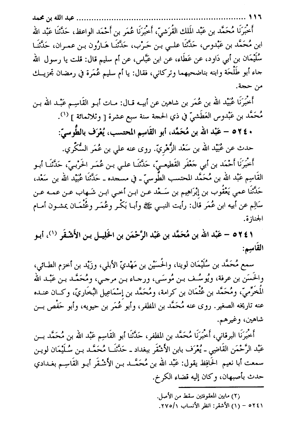 5241 عَبْد اللَّهِ بْن مُحَمَّد بْن عَبْد الرَّحْمَنِ بن الخليل بن الأشقر [2] ، أبو القاسم:
