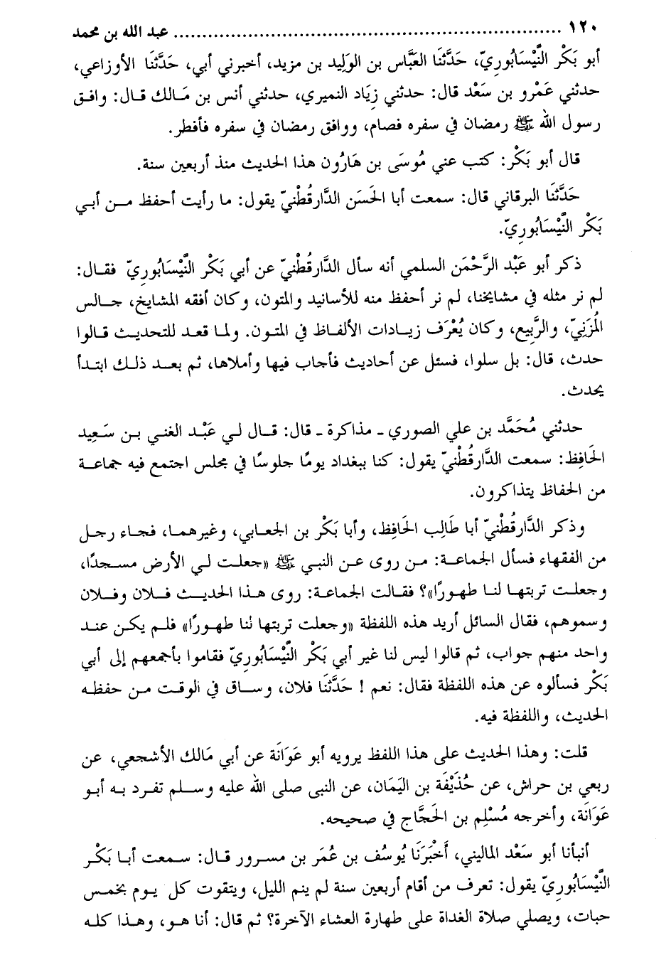 حَدَّثَنَا البرقاني قَالَ: سَمعت أبا الحسن الدارقطني يَقُول: ما رأيت أحفظ من أبي بكر النيسابوري.