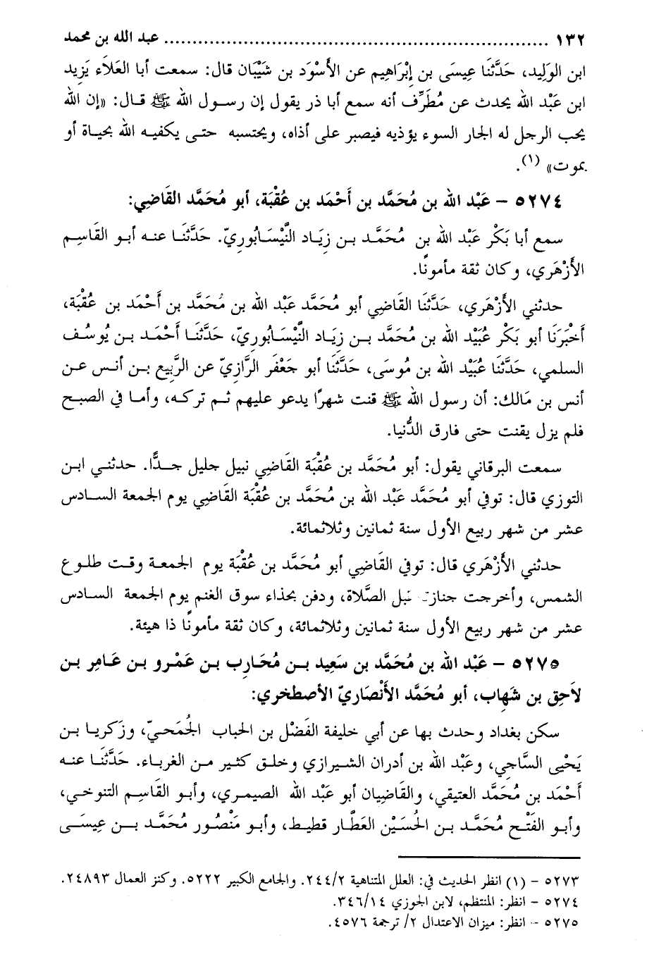 5274 عَبْدُ اللَّهِ بْنُ مُحَمَّدِ بْنِ أَحْمَدَ بْنِ عقبة، أبو مُحَمَّد الْقَاضِي [2] :