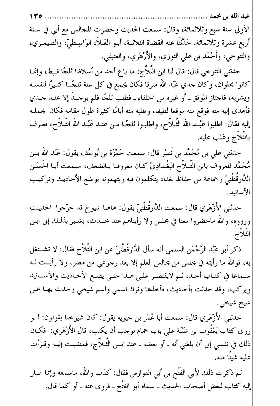 حَدَّثَنِي الأزهري قَالَ: سمعت الدّارقطنيّ يقول: هاهنا شيوخ قد خرجوا الحديث ورووه، واللَّه ما حضروا معنا في مجلس ولا رأيناهم عند محدث، يشير بذلك إلى ابن الثلاج.