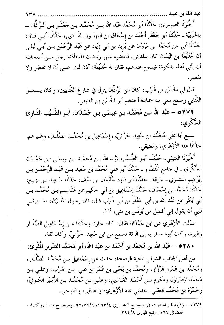 5279 عَبْد اللَّهِ بْن مُحَمَّد بْن عيسى بْن حمدان، أبو الطيب القارئ السكري:
