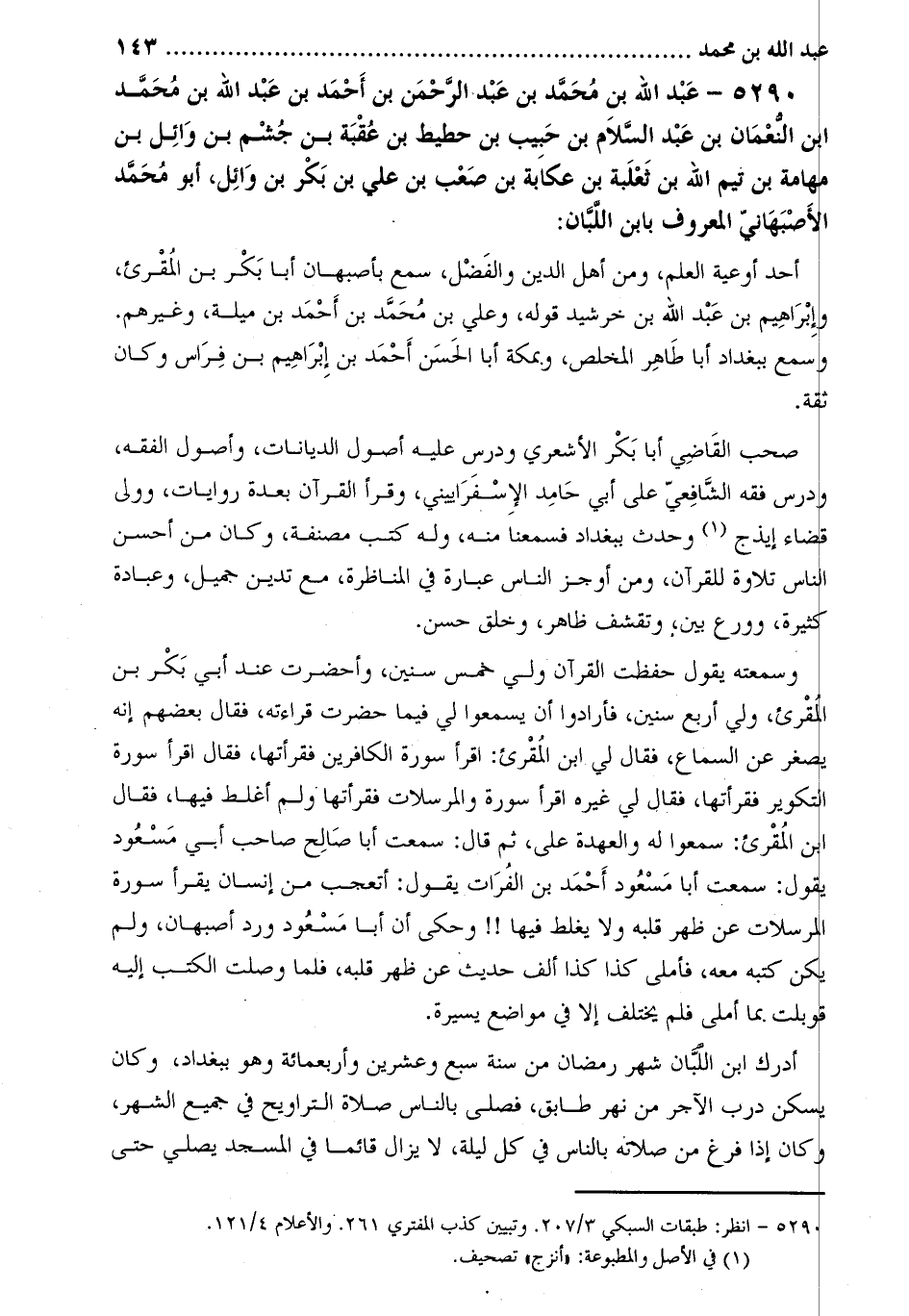 5290 عَبْد اللَّهِ بْن مُحَمَّد بْن عَبْد الرَّحْمَنِ بْن أَحْمَد بْن عَبْد اللَّه بْن مُحَمَّد ابن النعمان بن عبد السلام بن حبيب بن حطيط بن عقبة بن جشم بن وائل بن مهامة بن تيم اللَّه بْن ثعلبة بْن عكابة بْن صعب بْن علي بن بكر بن وائل، أبو مُحَمَّد الأصبهاني المعروف بابن اللبان [1] :