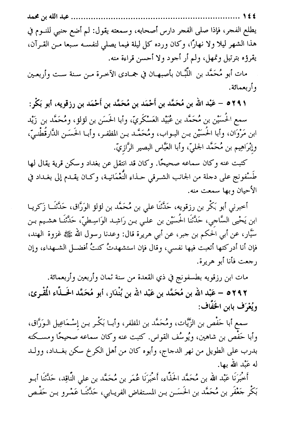 5292 عَبْد اللَّه بْن مُحَمَّد بْن عَبْد اللَّه بن بندار، أبو مُحَمَّد الحذاء المقرئ، ويعرف بابن الخفّاف: