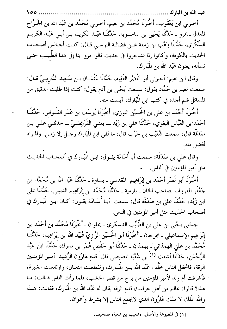 حَدَّثَنِي يَحْيَى بْنُ عَلِيِّ بْنِ الطَّيِّبِ الدَّسْكَرِيُّ- بِحُلْوَانَ- أَخْبَرَنَا مُحَمَّد بن أَحْمَد بْنُ إِبْرَاهِيمَ الإسماعيلي- بجرجان- أَخْبَرَنَا أبو الْحُسَيْن الرازي عبيد اللَّه بْنُ إبراهيم، حدّثنا محمّد بن علي الهمذاني- بهمذان- حدّثنا أبو حفص عمر بن مدرك، حدّثنا ابن عبد الرّحمن، حَدَّثَنَا أشعث [1] بن شعبة المصيصي قَالَ: قدم هارون الرشيد أمير المؤمنين الرقة، فانجفل الناس خلف عبد اللَّه بن المبارك، وتقطعت النعال، وارتفعت الغبرة، فأشرفت أم ولد لأمير المؤمنين من برج من قصر الخشب، فلما رأت الناس قَالت: ما هذا؟ قَالُوا: عالم من أهل خراسان قدم الرقة يقَالُ له عبد اللَّه بن المبارك، فقَالت: هذا واللَّه الملك لا ملك هارون الذي لا يجمع الناس إلا بشرط وأعوان.