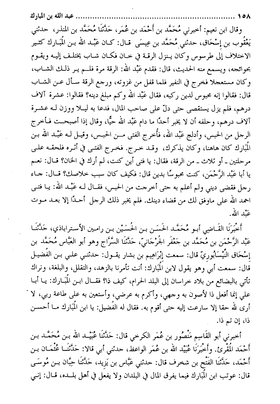 أَخْبَرَنَا الْقَاضِي أَبُو مُحَمَّد الْحَسَن بْن الْحُسَيْنِ بْنِ رامين الأستراباذي، حَدَّثَنَا عبد الرحمن بْن مُحَمَّد بْن جعفر الجرجاني، حَدَّثَنَا السراج وَهُوَ أَبُو الْعَبَّاس مُحَمَّد بْن إسحاق النيسابوري قَالَ: سمعت إِبْرَاهِيم بن بشار يَقُول: حَدَّثَنِي علي بن الفضيل قَالَ: سمعت أبي وهو يقول لابن المبارك: أنت تأمرنا بالزهد، والتقلل، والبلغة، ونراك تأتي بالبضائع من بلاد خراسان إلى البلد الحرام، كيف ذا؟ فقَالَ ابن المبارك: يا أبا علي إنما أفعل ذا لأصون به وجهي، وأكرم به عرضي، واستعين به على طاعة ربي، لا أرى لله حقًا إلا سارعت إليه حتى أقوم به. فقَالَ له الفضيل: يا ابن المبارك ما أحسن ذا، إن تم ذا.