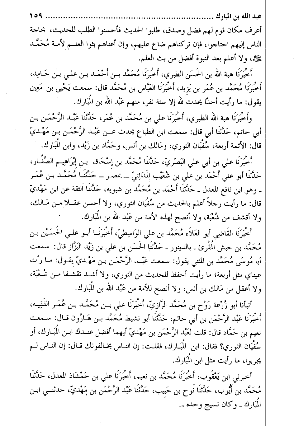 أخبرني ابن يعقوب، أخبرنا محمّد بن نعيم، أخبرنا علي بن حمشاذ المعدل، حدّثنا محمّد بن أيّوب، حدّثنا نوح بن حبيب، حدّثنا عبد الرّحمن بن مهديّ، حَدَّثَنِي ابن المبارك- وكان نسيج وحده-.