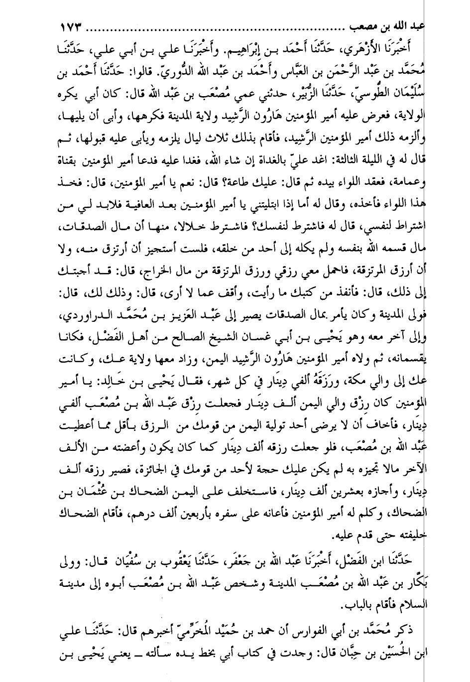 أخبرنا الأزهري، حَدَّثَنَا أَحْمَد بْنُ إِبْرَاهِيمَ. وأَخْبَرَنَا علي بن أبي علي، حَدَّثَنَا مُحَمَّد بْنُ عَبْدِ الرَّحْمَنِ بْنِ الْعَبَّاسِ وأَحْمَد بن عبد اللَّه الدوري. قَالُوا: حَدَّثَنَا أَحْمَد بن سليمان الطّوسيّ، حدّثنا الزبير، حَدَّثَنِي عمي مصعب بن عبد اللَّه قَالَ: كان أبي يكره الولاية، فعرض عليه أمير المؤمنين هارون الرشيد ولاية المدينة فكرهها، وأَبَى أن يليها، وألزمه ذلك أمير المؤمنين الرشيد، فأقام بذلك ثلاث ليال يلزمه ويأَبَى عليه قبولها، ثم قَالَ له في الليلة الثالثة: اغد علي بالغداة إن شاء اللَّه، فغدا عليه فدعا أمير المؤمنين بقناة وعمامة، فعقد اللواء بيده ثم قَالَ: عليك طاعة؟ قَالَ: نعم يا أمير المؤمنين، قَالَ: فخذ هذا اللواء فأخذه، وقال له أما إذا ابتليتني يا أمير المؤمنين بعد العافية فلا بد لي من اشتراط لنفسي، قَالَ له فاشترط لنفسك؟ فاشترط خلالًا، منها أن مال الصدقات، مال قسمة اللَّه بنفسه ولم يكله إلى أحد من خلقه، فلست استجيز أن أرتزق منه، ولا أن أرزق المرتزقة، فأحمل معي رزقي ورزق المرتزقة من مال الخراج، قَالَ: قد أجبتك إلى ذلك، قال: فأنفذ من كتبك ما رأيت، وأقف عما لا أرى، قَالَ: وذلك لك، قَالَ: