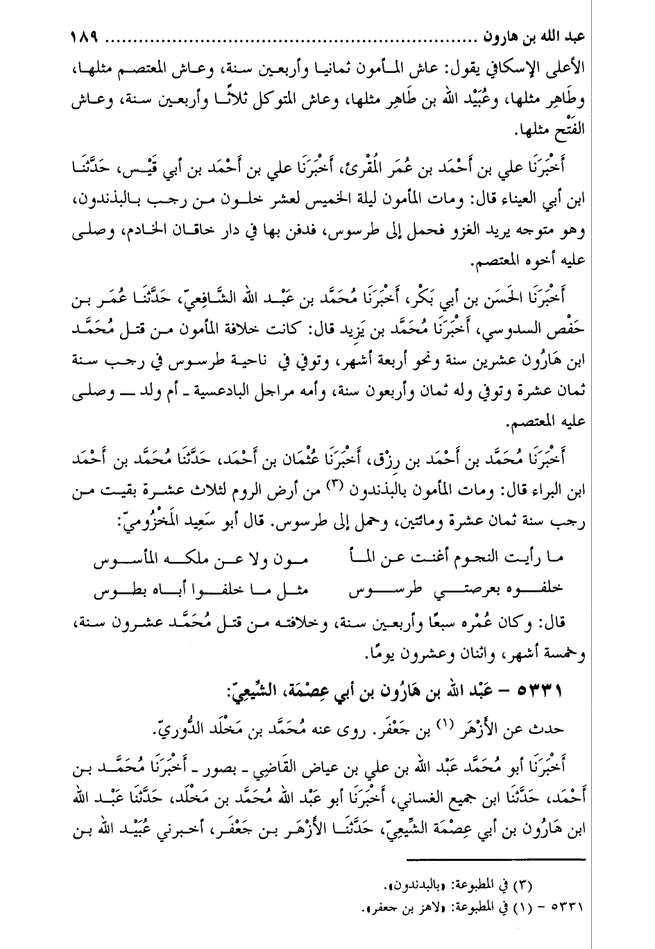 أَخْبَرَنَا مُحَمَّد بن أَحْمَد بن رزق، أخبرنا عثمان بن أحمد، حَدَّثَنَا مُحَمَّدُ بْنُ أَحْمَدَ ابْنِ الْبَرَاءِ قَالَ: ومات المأمون بالبذندون [1] من أرض الروم لثلاث عشرة بقيت من رجب سنة ثَمان عشرة ومائتين، وحمل إلى طرسوس. قَالَ أَبُو سعيد المخزومي: