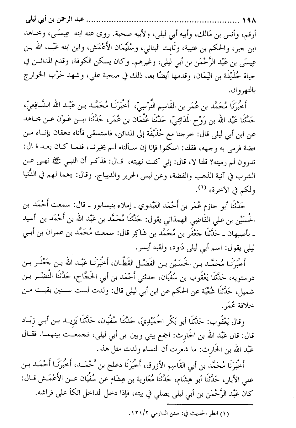 أَخْبَرَنَا مُحَمَّدُ بْنُ عُمَرَ بْنِ الْقَاسِمِ النَّرْسِيُّ، أخبرنا محمّد بن عبد الله الشّافعيّ، حدّثنا عبد الله بن روح المدائنيّ، حدّثنا عثمان بن عمر، حَدَّثَنَا ابْنُ عَوْنٍ عَنْ مُجَاهِدٍ عَنِ ابْنِ أَبِي لَيْلَى قَالَ: خَرَجْنَا مَعَ حُذَيْفَةَ إِلَى الْمَدَائِنِ، فَاسْتَسْقَى فَأَتَاهُ دِهْقَانُ بِإِنَاءٍ مِنْ فِضَّةٍ فَرَمَى بِهِ وَجْهَهُ، فَقُلْنَا: اسْكُتُوا فَإِنَّا إِنْ سَأَلْنَاهُ لَمْ يُخْبِرْنَا، فَلَمَّا كَانَ بَعْدُ قَالَ: