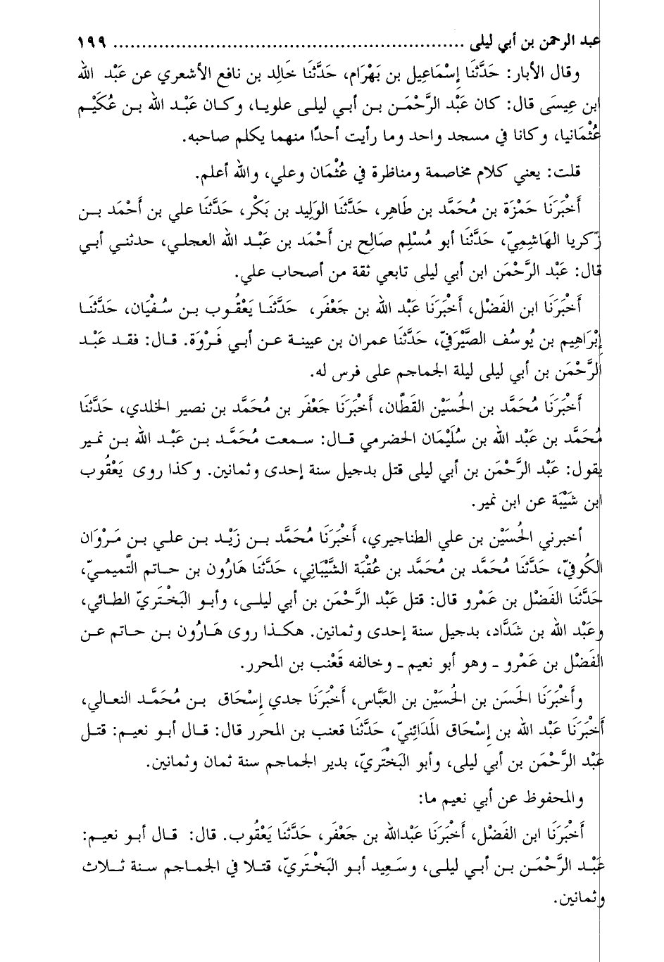 أَخْبَرَنَا مُحَمَّد بن الحسين القطّان، أخبرنا جعفر بن محمد بن نصير الخلدي، حدثنا محمد بن عبد الله بن سليمان الحضرمي قَالَ: سَمِعْتُ مُحَمَّد بْن عَبْدِ اللَّهِ بْنِ نُمير يَقُول: عبد الرحمن بن أبي ليلى قتل بدجيل سنة إحدى وثمانين. وكذا روى يعقوب ابن شيبة عن ابن نُمير.