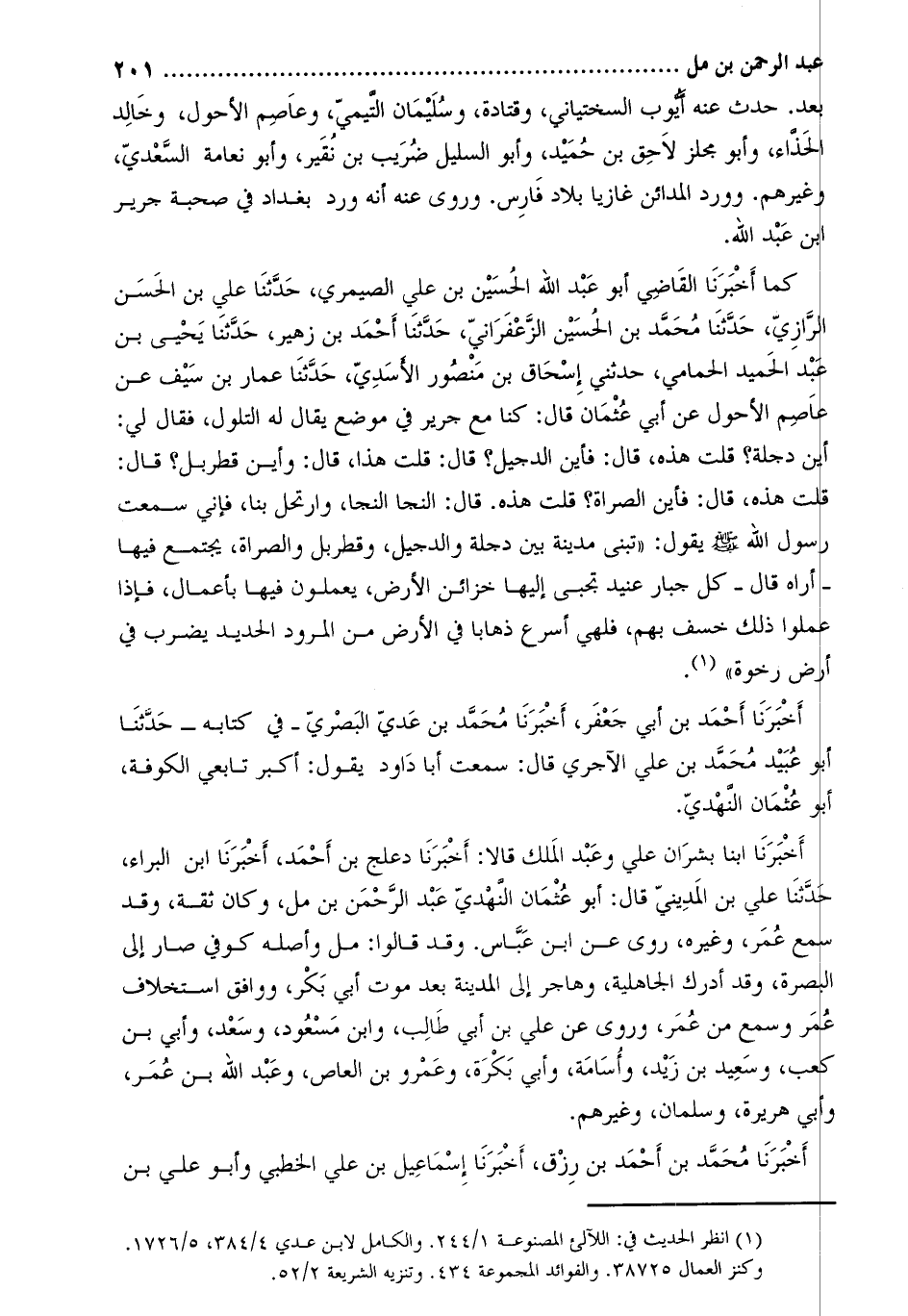كَمَا أَخْبَرَنَا الْقَاضِي أَبُو عَبْدِ اللَّهِ الْحُسَيْنُ بْنُ علي الصيمري، حدّثنا علي بن الحسن الرّازيّ، حدّثنا محمّد بن الحسين الزّعفرانيّ، حدّثنا أحمد بن زهير، حدّثنا يحيى بن عبد الحميد الحمامي، حدثني إسحاق بن منصور الأسديّ، حَدَّثَنَا عَمَّارُ بْنُ سَيْفٍ عَنْ عَاصِمٍ الأَحْوَلِ عَنْ أَبِي عُثْمَانَ قَالَ: كُنَّا مَعَ جَرِيرٍ فِي مَوْضِعٍ يُقَالُ لَهُ التُّلُولُ، فَقَالَ لي: