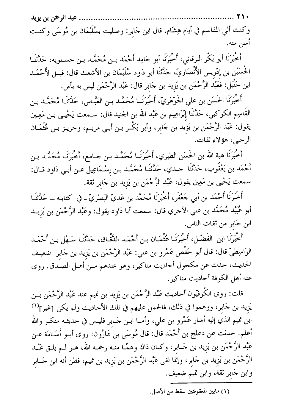 قلت: روى الكوفيّون أحاديث عبد الرحمن بن يزيد بن تميم عند عبد الرحمن بن يزيد بن جابر، ووهموا في ذلك، فالحمل عليهم في تلك الأحاديث ولم يكن [غير] [1] ابن تميم الذي إليه أشار عمرو بن علي، وأما ابن جابر فليس في حديثه منكر واللَّه أعلم. حَدَّثتُ عَنْ دعلج بْن أَحْمَد قَالَ: قَالَ مُوسَى بْن هارون: رَوى أَبُو أسامة عَنْ عَبْدِ الرَّحْمَنِ بْنِ يَزِيدَ بْنِ جَابِرٍ، وكان ذاك وهمًا منه رحمه اللَّه، هُوَ لم يلق عَبْد الرَّحْمَن بْن يزيد بْن جَابِر، وإنما لقي عَبْد الرَّحْمَن بْن يزيد بْن تميم، فظن أَنَّهُ ابن جَابِر وابن جَابِر ثقة، وابن تميم ضعيف.