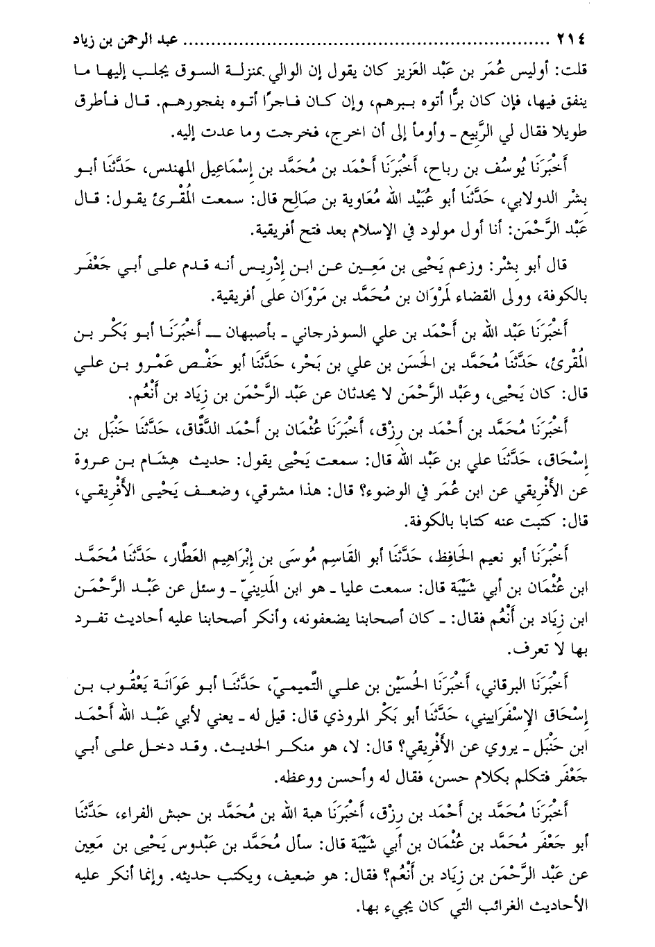 أَخْبَرَنَا أبو نعيم الحافظ، حَدَّثَنَا أبو القاسم موسى بْنُ إِبْرَاهِيمَ العطار، حدّثنا محمّد ابن عُثْمَان بْن أَبِي شيبة قَالَ: سمعت عليا- هو ابن المديني- وسئل عن عبد الرحمن ابن زياد بن أنعم فقال: - كان أصحابنا يضعفونه، وأنكر أصحابنا عليه أحاديث تفرد بها لا تعرف.