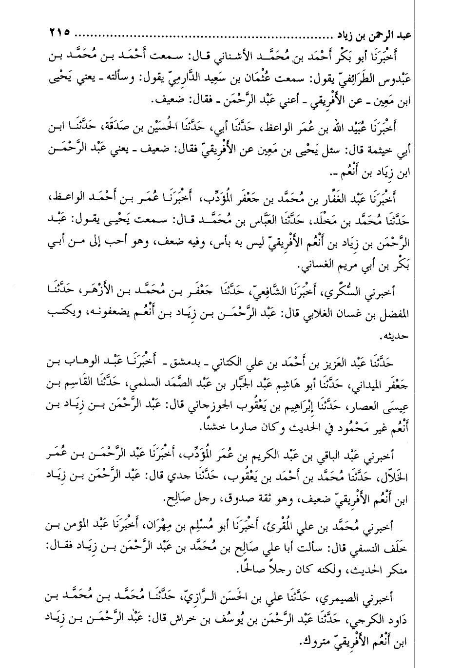 أَخْبَرَنِي عَبْد الباقي بْن عَبْد الكريم بْن عمر المؤدب، أَخْبَرَنَا عَبْد الرَّحْمَن بْن عُمَر الخلال، حَدَّثَنَا محمّد بن أحمد بن يعقوب، حَدَّثَنَا جدي قَالَ: عبد الرحمن بن زياد ابن أنعم الأفريقي ضعيف، وهو ثقة صدوق، رجل صالح.