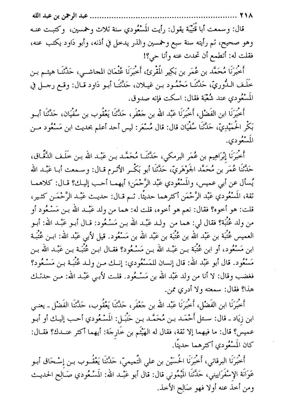 أخبرنا ابْن الْفَضْل، أَخْبَرَنَا عَبْدُ اللَّهِ بْنُ جَعْفَرٍ، حَدَّثَنَا يعقوب بن سفيان، حدّثنا أبو بكر الحميديّ، حَدَّثَنَا سفيان قَالَ: قَالَ مسعر: ليس أحد أعلم بحديث ابن مسعود من المسعودي.