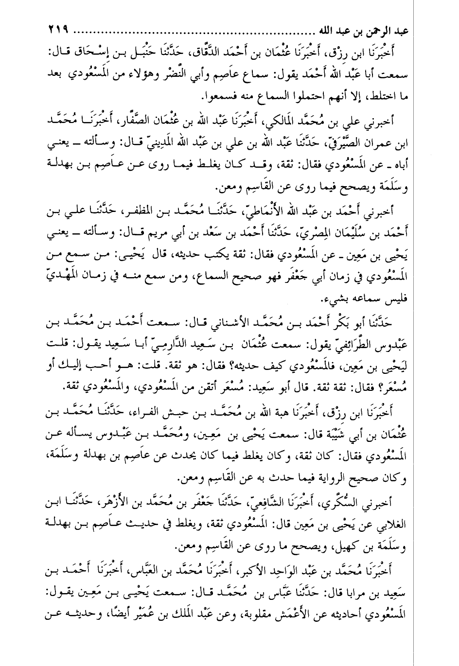 أَخْبَرَنِي علي بن محمّد المالكي، أخبرنا عبد الله بن عثمان الصّفّار، أخبرنا محمّد ابن عمران الصّيرفيّ، حدثنا عَبْد اللَّه بْن عليّ بْن عَبْد اللَّه المَدينِي قَالَ: وَسألته- يعني أباه- عَنِ المسعودي فَقَالَ: ثقة، وقد كان يغلط فيما روى عن عاصم بن بهدلة وسلمة ويصحح فيما روى عن القاسم ومعن.
