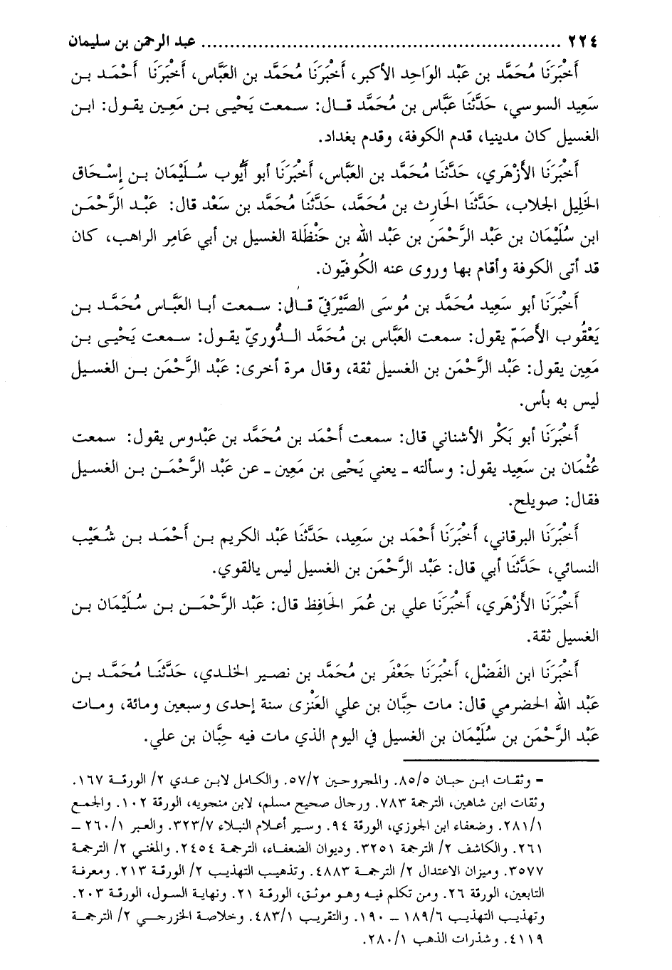 أَخْبَرَنَا أَبُو بكر الأشناني قَالَ: سمعت أَحْمَد بن محمد بن عبدوس يقول: سمعت عُثْمَان بن سعيد يقول: وسألته- يعني يَحْيَى بن معين- عن عبد الرحمن بن الغسيل فقَالَ: صويلح.