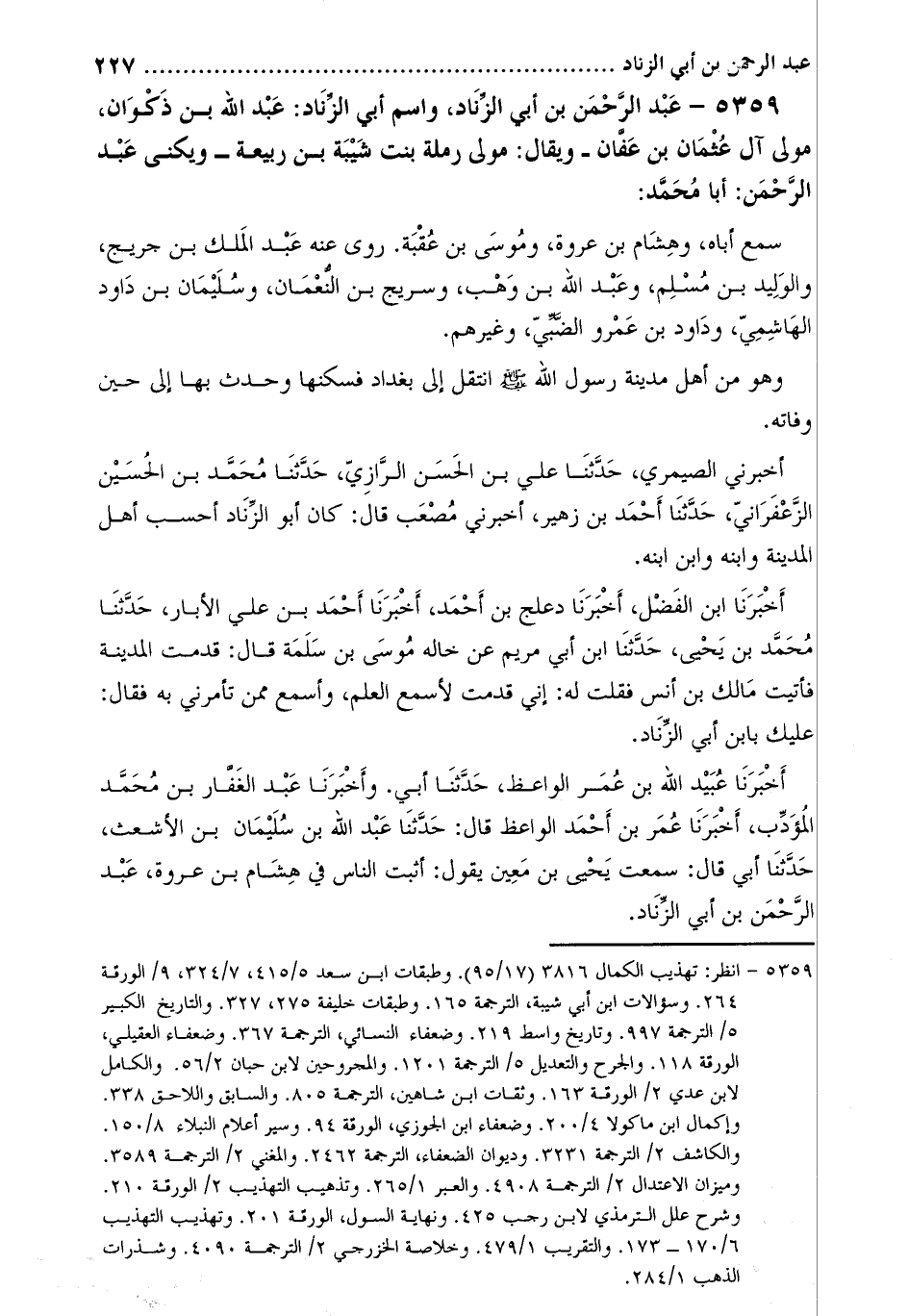 5359 عبد الرحمن بن أبي الزناد، واسم أَبِي الزناد: عبد اللَّه بن ذكوان، مولى آل عثمان بن عفان- ويقَالَ: مولى رملة بنت شيبة بن ربيعة- ويكنى عبد الرحمن: أبا مُحَمَّد [1] :