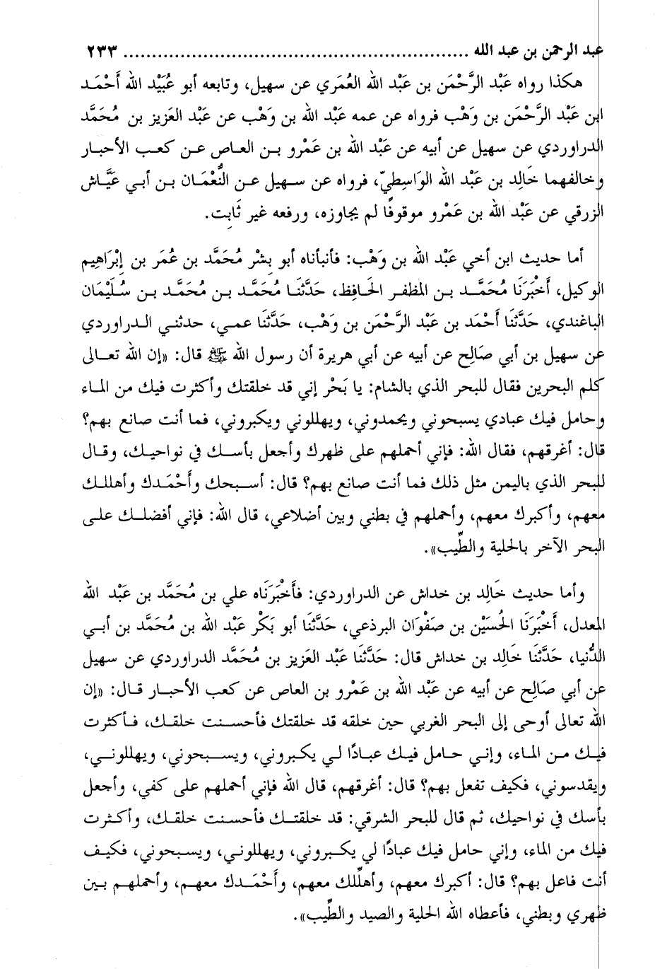 أَمَّا حَدِيثُ ابْنَ أَخِي عَبْدِ اللَّهِ بن وهب: فأنبأناه أَبُو بِشْرٍ مُحَمَّدُ بْنُ عُمَرَ بْنِ إِبْرَاهِيمَ الوكيل، أخبرنا محمّد بن المظفر الحافظ، حَدَّثَنَا محمد بن محمد بن سليمان الباغندي، حَدَّثَنَا أَحْمَدُ بْنُ عَبْدِ الرَّحْمَنِ بْنِ وَهْبٍ، حدّثنا عمي، حَدَّثَنِي الدَّرَاوَرْدِيُّ عَنْ سُهَيْلِ بْنِ أَبِي صَالِحٍ عَنْ أَبِيهِ عَنْ أَبِي هُرَيْرَةَ أَنَّ رَسُولَ اللَّهِ صَلَّى اللَّهُ عَلَيْهِ وَسَلَّمَ قَالَ: «إِنَّ اللَّهَ تَعَالَى كَلَّمَ الْبَحْرَيْنِ فَقَالَ لِلْبَحْرِ الَّذِي بِالشَّامِ: يَا بَحْرُ إِنِّي قَدْ خَلَقْتُكَ وَأَكْثَرْتُ فيك من الماء وحامل فيك عبادي يُسَبِّحُونِي وَيَحْمَدُونِي، وَيُهَلِّلُونِي وَيُكَبِّرُونِي، فَمَا أَنْتَ صَانِعٌ بِهِمْ؟