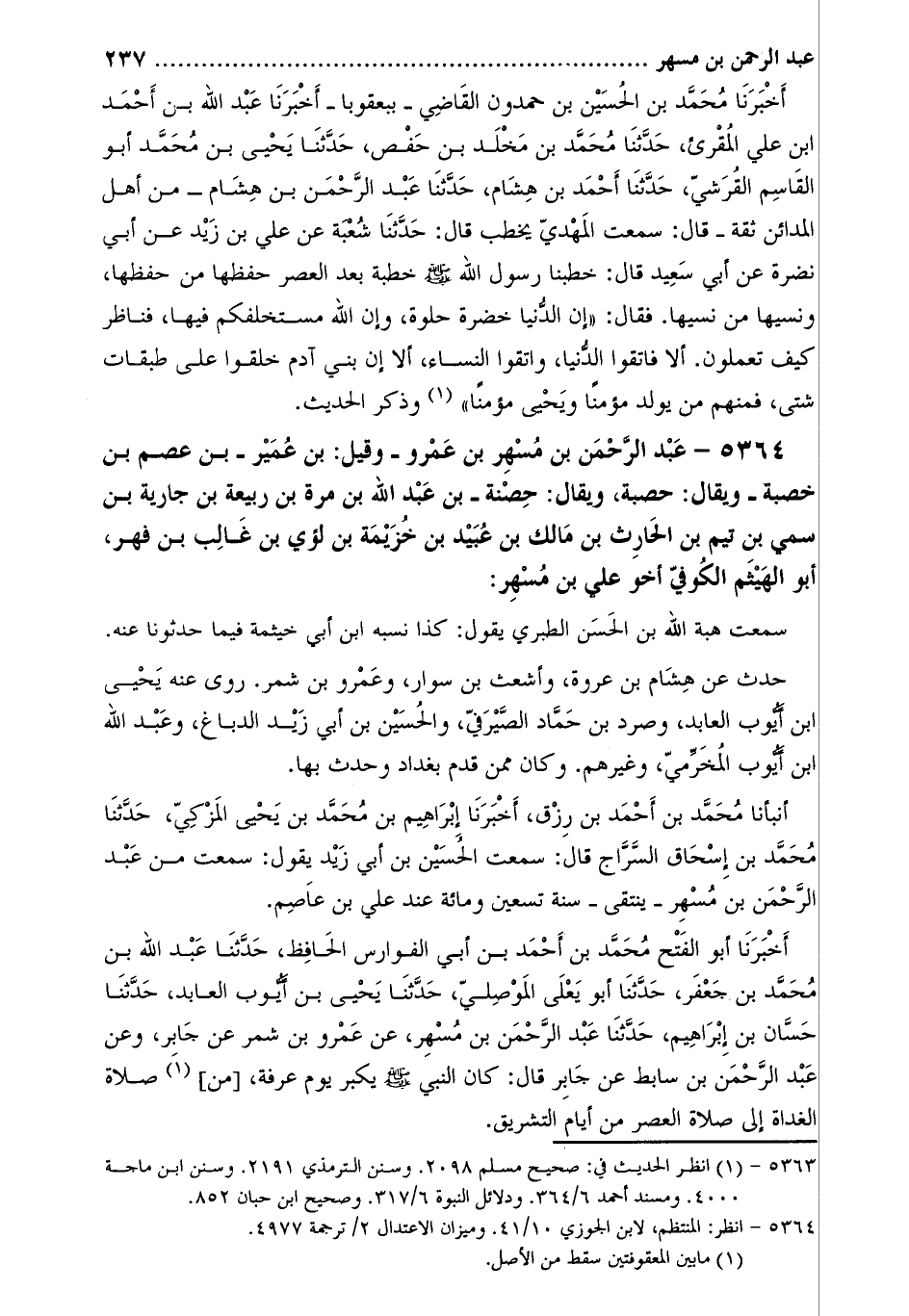أَخْبَرَنَا مُحَمَّدُ بْنُ الْحُسَيْنِ بْنِ حَمْدُونٍ الْقَاضِي- بِبَعْقُوبَا- أخبرنا عبد الله بن أحمد ابن علي المقرئ، حدّثنا محمّد بن مخلد بن حفص، حَدَّثَنَا يَحْيَى بْنِ مُحَمَّدٍ أَبُو الْقَاسِمِ الْقُرَشِيُّ، حدّثنا أحمد بن هشام، حَدَّثَنَا عَبْدُ الرَّحْمَنِ بْنُ هِشَامٍ- مِنْ أَهْلِ الْمَدَائِنِ ثِقَةٌ- قَالَ: سَمِعْتُ الْمَهْدِيَّ يَخْطُبُ قَالَ: حَدَّثَنَا شُعْبَةُ عَنْ عَلِيِّ بْنِ زَيْدٍ عَنْ أَبِي نَضْرَةَ عَنْ أَبِي سَعِيدٍ قَالَ: خَطَبَنَا رَسُولُ اللَّهِ صَلَّى اللَّهُ عَلَيْهِ وَسَلَّمَ خُطْبَةً بَعْدَ الْعَصْرِ حَفِظَهَا مَنْ حَفِظَهَا، وَنَسِيَهَا مَنْ نَسِيَهَا. فَقَالَ: «إِنَّ الدُّنْيَا خَضِرَةٌ حُلْوَةٌ، وَإِنَّ اللَّهَ مُسْتَخْلِفُكُمْ فِيهَا، فَنَاظِرٌ كَيْفَ تَعْمَلُونَ. أَلا فَاتَّقُوا الدُّنْيَا، وَاتَّقُوا النِّسَاءَ، أَلا إِنَّ بَنِي آدَمَ خُلِقُوا عَلَى طَبَقَاتٍ شَتَّى، فَمِنْهُمْ مَنْ يُولَدُ مُؤْمِنًا وَيَحْيَى مُؤْمِنًا» [1]