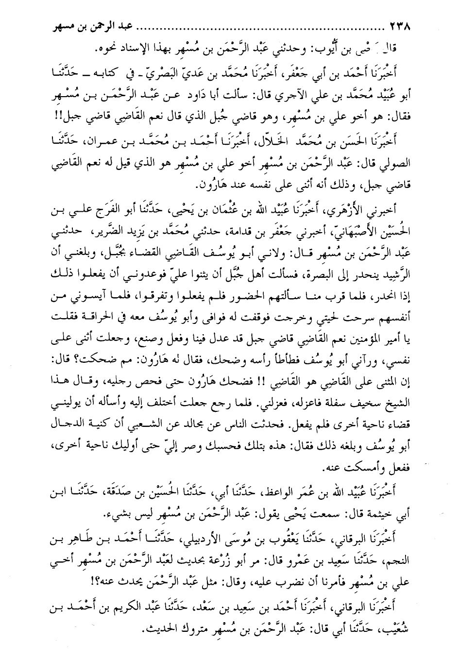 أَخْبَرَنَا أَحْمَد بن أبي جعفر، أخبرنا محمد بن عدي البصري- في كتابه- حدثنا أبو عبيد محمد بن علي الآجري قال: سألت أبا داود عن عبد الرحمن بن مسهر فقَالَ: هو أخو علي بن مسهر، وهو قاضي جبل الذي قَالَ نعم الْقَاضِي قاضي جبل!! أَخْبَرَنَا الْحَسَن بن مُحَمَّد الخلّال، أخبرنا أحمد بن محمّد بن عمران، حَدَّثَنَا الصولي قَالَ: عبد الرحمن بن مسهر أخو علي بن مسهر هو الذي قيل له نعم الْقَاضِي قاضي جبل، وذلك أنه أثنى علي نفسه عند هارون.