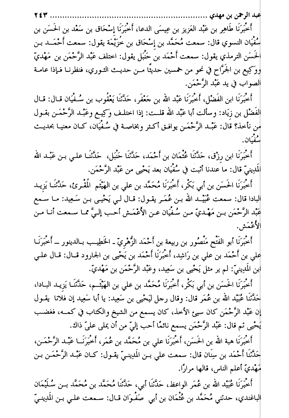 أَخْبَرَنَا هبة اللَّه بن الحسن، أخبرنا علي بن محمّد بن عمر، أخبرنا عبد الرّحمن، حدّثنا أحمد بن سنان قال: سمعت علي بن المديني يَقُول: كان عبد الرحمن بن مهدي أعلم الناس، قَالَها مرارًا.