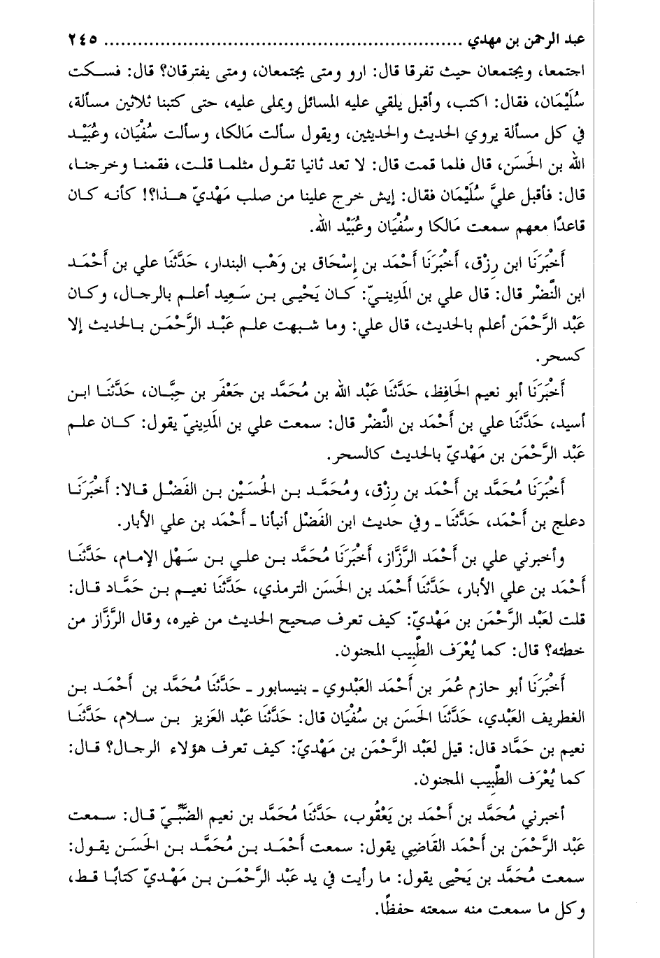 أَخْبَرَنَا أَبُو حازم عُمَر بْن أَحْمَد العبدوي- بنيسابور- حَدَّثَنَا مُحَمَّد بْن أَحْمَد بْن الغطريف العبدي، حَدَّثَنَا الْحَسَن بْن سُفْيان قَالَ: حَدَّثَنَا عَبْد العزيز بْن سلام، حَدَّثَنَا نُعَيم بْن حمَّاد قَالَ: قِيلَ لعبد الرَّحْمَن بْن مهدي: كيف تعرف هَؤُلَاءِ الرجال؟ قَالَ: