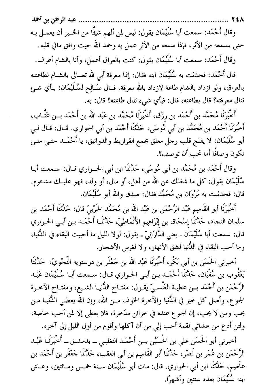 أَخْبَرَنِي أَبُو الْحَسَن عَلِيُّ بْنُ الْحُسَيْن بْنِ أَحْمَد التغلبي- بدمشق- أَخْبَرَنَا عبد الرحمن بن عمر بن نصر، حدّثنا أبو القاسم بن أبي العقب، حدّثنا جعفر بن أحمد بن عاصم، حَدَّثَنَا ابن أبي الحواري. قَالَ: مات أبو سليمان سنة خمس ومائتين، وعاش ابنه سليمان بعده سنتين وأشهرًا.