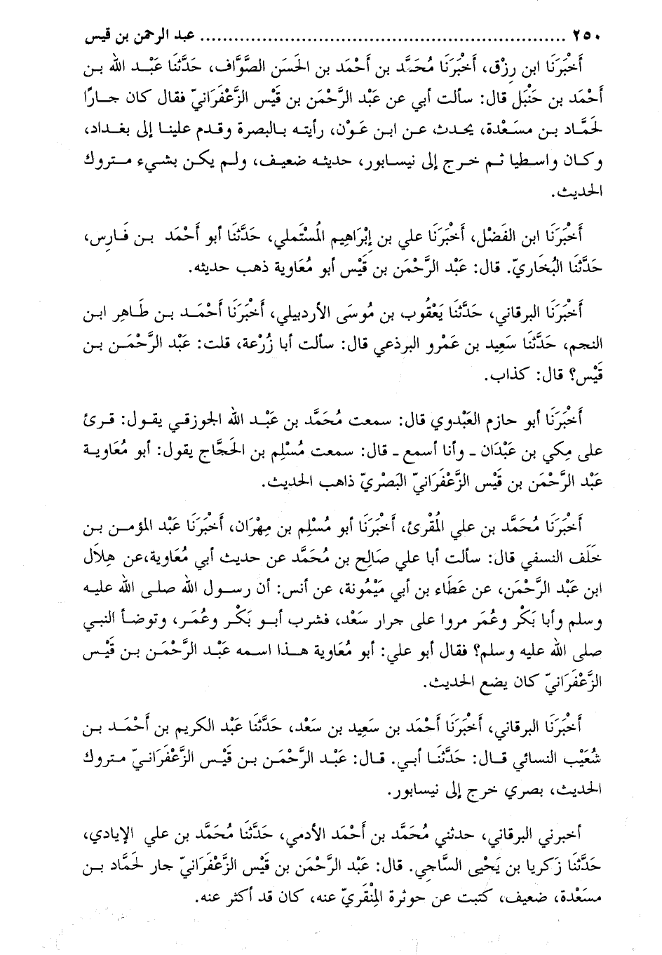 أخبرنا البرقاني، أخبرنا أحمد بن سعيد بن سعد، حدثنا عبد الكريم بن أحمد بن شعيب النسائي قال: حدثنا أبي. قال: عبد الرحمن بن قيس الزعفراني متروك الحديث، بصري خرج إلى نيسابور.