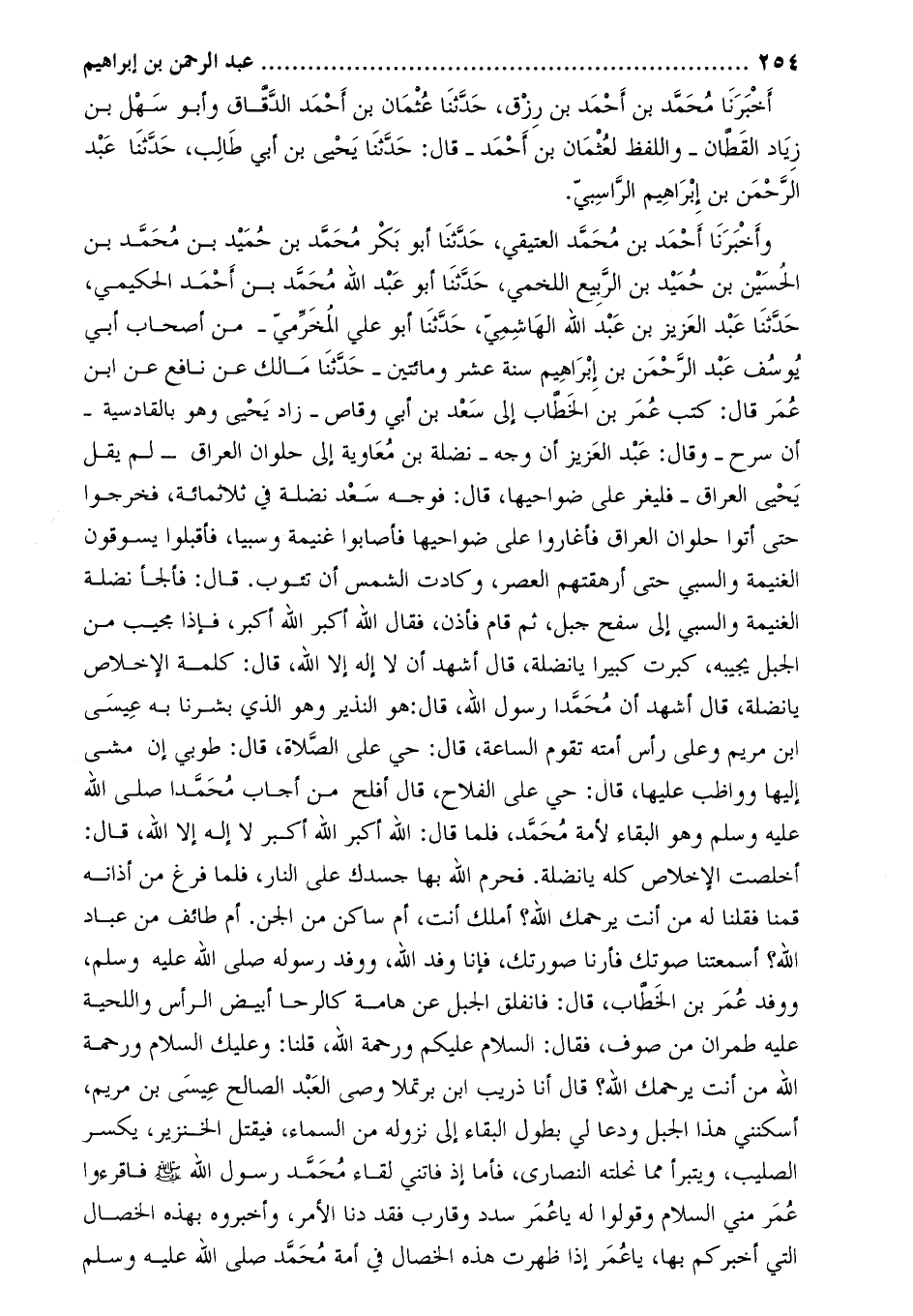 وَأَخْبَرَنَا أحمد بن محمّد العتيقي، حَدَّثَنَا أَبُو بَكْر مُحَمَّد بْن حُمَيْدِ بْن مُحَمَّد بْن الْحُسَيْن بْن حميد بْن الربيع اللخمي، حَدَّثَنَا أَبُو عَبْدِ اللَّهِ مُحَمَّدُ بْنُ أَحْمَدَ الحكيمي، حدثنا عبد العزيز بن عبد الله الهاشمي، حَدَّثَنَا أَبُو عَلِيٍّ الْمَخْرَمِيُّ- مِنْ أَصْحَابِ أَبِي يُوسُفَ عَبْدُ الرَّحْمَنِ بْنُ إِبْرَاهِيمَ سَنَةَ عَشْرٍ ومائتين- حَدَّثَنَا مَالِكٌ عَنْ نَافِعٍ عَنِ ابْنِ عُمَرَ قَالَ: كَتَبَ عُمَرُ بْنُ الْخَطَّابِ إِلَى سَعْدِ بْنِ أبي وقاص- زاد يحيى وهو بالقادسية- أَنْ سَرِّحْ- وَقَالَ: عَبْدُ الْعَزِيزِ أَنْ وَجِّهْ- نَضْلَةَ بْنَ مُعَاوِيَةَ إِلَى حُلْوَانَ الْعِرَاقَ- لَمْ يَقُلْ يَحْيَى الْعِرَاقَ- فَلْيُغِرْ عَلَى ضَوَاحِيهَا، قَالَ: فَوَجَّهَ سَعْدٌ نَضْلَةَ في ثلاثمائة، فَخَرَجُوا حَتَّى أَتَوْا حُلْوَانَ الْعِرَاقَ فَأَغَارُوا عَلَى ضَوَاحِيهَا فَأَصَابُوا غَنِيمَةً وَسَبْيًا، فَأَقْبَلُوا يَسُوقُونَ الْغَنِيمَةَ وَالسَّبْيَ حَتَّى أَرْهَقَتْهُمُ الْعَصْرَ، وَكَادَتِ الشَّمْسُ أَنْ تَئُوبَ. قَالَ: فَأَلْجَأَ نَضْلَةُ الْغَنِيمَةَ وَالسَّبْيَ إِلَى سَفْحِ جَبَلٍ، ثُمَّ قَامَ فَأَذَّنَ، فَقَالَ اللَّهُ أَكْبَرُ اللَّهُ أَكْبَرُ، فَإِذَا مُجِيبٌ مِنَ الْجَبَلِ يُجِيبُهُ، كَبَّرْتَ كَبِيرًا يَا نَضْلَةُ، قَالَ أَشْهَدُ أَنْ لا إِلَهَ إِلا اللَّهُ، قَالَ: كَلِمَةُ الإِخْلاصِ يَا نَضْلَةُ، قَالَ أَشْهَدُ أَنَّ مُحَمَّدًا رَسُولُ اللَّهِ، قَالَ: هُوَ النَّذِيرُ وَهُوَ الَّذِي بَشَّرَنَا بِهِ عِيسَى ابْنُ مَرْيَمَ وَعَلَى رَأْسِ أُمَّتِهِ تَقُومُ السَّاعَةُ، قَالَ: حَيَّ عَلَى الصَّلاةِ، قَالَ: طُوبَى إن مَشَى إِلَيْهَا وَوَاظَبَ عَلَيْهَا، قَالَ: حَيَّ عَلَى الفلاح، قال أفلح من أجاب محمّدا صلّى الله عليه وسلم وَهُوَ الْبَقَاءُ لأُمَّةِ مُحَمَّدٍ، فَلَمَّا قَالَ: اللَّهُ أَكْبَرُ اللَّهُ أَكْبَرُ لا إِلَهَ إِلا اللَّهُ، قَالَ: