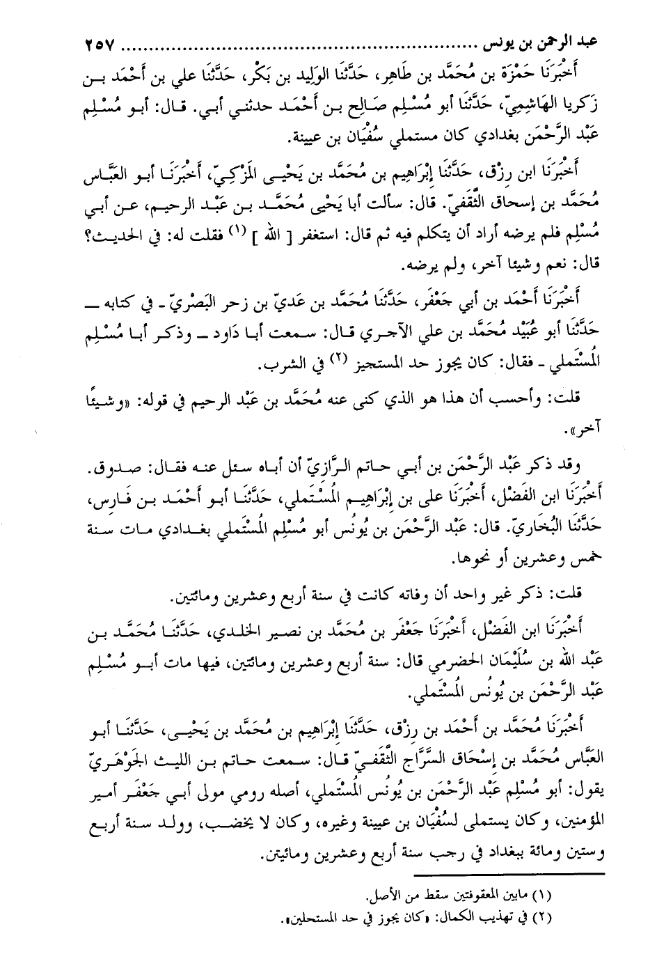 أَخْبَرَنَا ابن الفضل، أخبرنا على بن إبراهيم المستملي، حدّثنا أبو أحمد بن فارس، حَدَّثَنَا البخاري. قَالَ: عبد الرحمن بن يونس أبو مسلم المستملي بغدادي مات سنة خمس وعشرين أو نحوها.