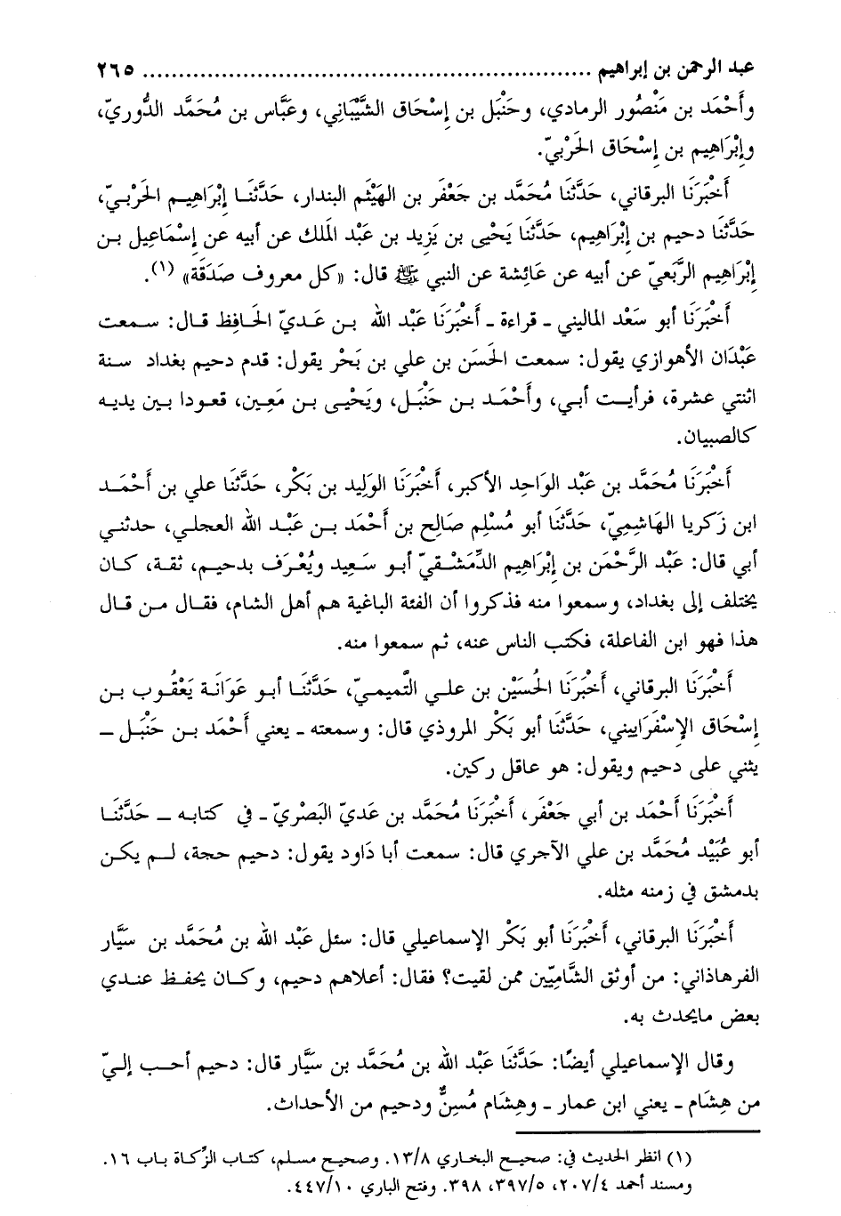 أخبرنا البرقاني، حدّثنا محمّد بن جعفر بن الهيثم البندار، حدّثنا إبراهيم الحربيّ، حدّثنا دحيم بن إبراهيم، حَدَّثَنَا يَحْيَى بْنُ يَزِيدَ بْنِ عَبْدِ الْمَلِكِ عَنْ أَبِيهِ عَنْ إِسْمَاعِيلَ بْنِ إِبْرَاهِيمَ الرَّبَعِيِّ عَنْ أَبِيهِ عَنْ عَائِشَةَ عَنِ النَّبِيِّ صَلَّى اللَّهُ عَلَيْهِ وَسَلَّمَ قَالَ: «كُلُّ مَعْرُوفٍ صَدَقَةٌ» [1] .