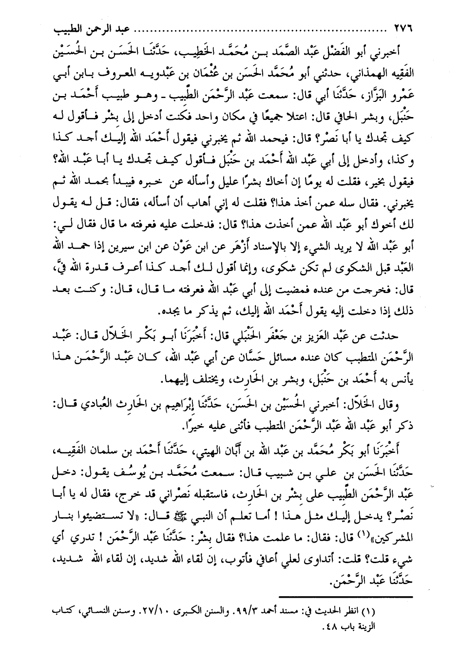 أَخْبَرَنِي أَبُو الْفَضْل عَبْد الصمد بْن مُحَمَّد الخطيب، حدّثنا الحسن بن الحسين الفقيه الهمذاني، حَدَّثَنِي أَبُو مُحَمَّدٍ الْحَسَنُ بْنُ عُثْمَانَ بْنِ عَبْدَوَيْهِ المعروف بابن أبي عمرو البزّاز، حَدَّثَنَا أبي قَالَ: سمعت عبد الرحمن الطبيب- وهو طبيب أَحْمَد بن حنبل، وبشر الحافي قَالَ: اعتلا جميعا في مكان واحد فكنت أدخل إلى بشر فأقول له كيف تجدك يا أبا نصر؟ قَالَ: فيحمد اللَّه ثم يخبرني فيَقُول أَحْمَد اللَّه إليك أجد كذا وكذا، وأدخل إِلَى أَبِي عَبْد اللَّهِ أَحْمَد بن حنبل فأقول كيف تجدك يا أبا عبد اللَّه؟