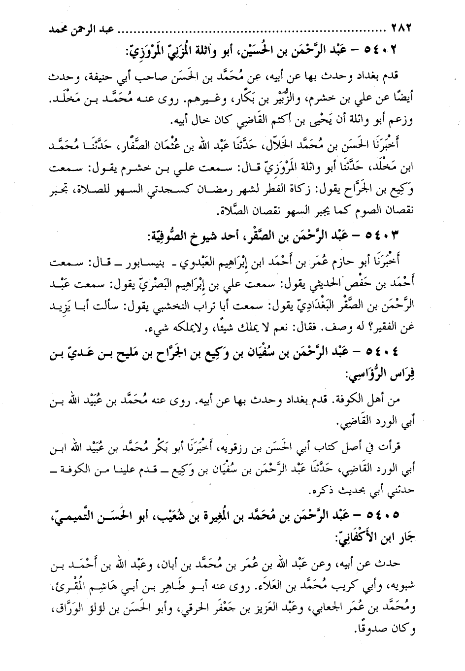 5404 عَبْد الرَّحْمَن بن سفيان بن وكيع بن الجراح بن مليح بن عدي بن فراس الرؤاسي: