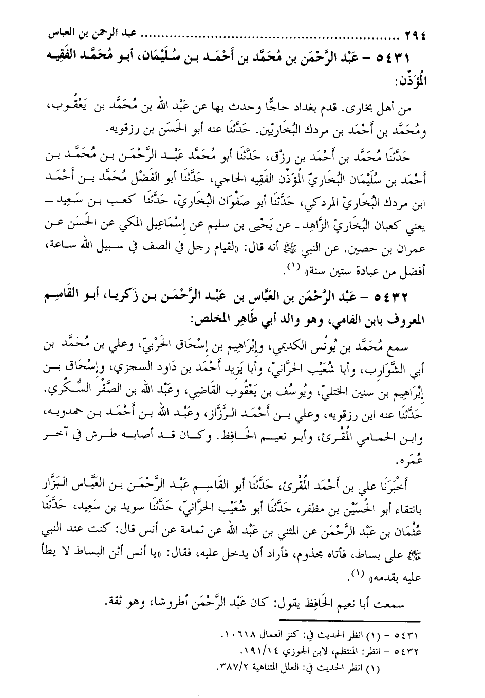 5431 عَبْد الرَّحْمَنِ بْن مُحَمَّد بْن أَحْمَد بْن سليمان، أبو مُحَمَّد الفقيه المؤذن: