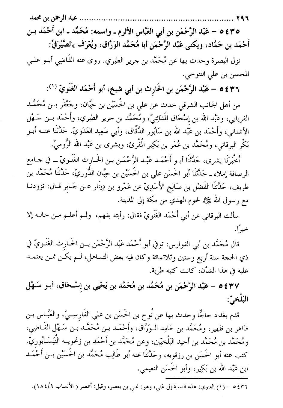5435 عبد الرحمن بن أبي العباس الأثرم- واسمه: محمّد- ابن أَحْمَد بن أَحْمَد بن حماد، ويكنى عبد الرحمن أبا مُحَمَّد الوراق، ويعرف بالصيرفي: