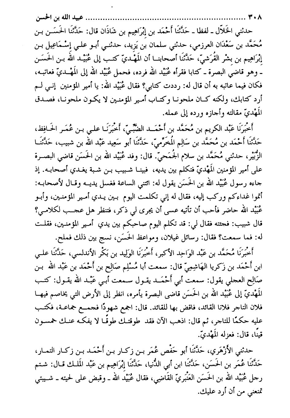 حدّثني الخلّال- لفظا- حدثنا أحمد بن إبراهيم بن شاذان قال: حَدَّثَنَا الْحَسَنُ بْنُ مُحَمَّدِ بْنِ سَعْدَانَ الْعَرْزَمِيُّ، حدّثني سلمان بن يزيد، حَدَّثَنِي أبو علي إسماعيل بن إبراهيم بن بشر القرشيّ، حَدَّثَنَا أصحابنا أن المهدي كتب إلى عبيد الله بن الحسن- وهو قاضي البصرة- كتابا فقرأه عبيد الله فرده، فحمل عبيد الله إلى المهدي فعاتبه، فكان فيما عاتبه به أن قال له: رددت كتابي؟ فقال عبيد الله: يا أمير المؤمنين إني لم أرد كتابك، ولكنه كان ملحونا وكتاب أمير المؤمنين لا يكون ملحونا، فصدق المهدي مقالته وأجازه ورده إلى عمله.