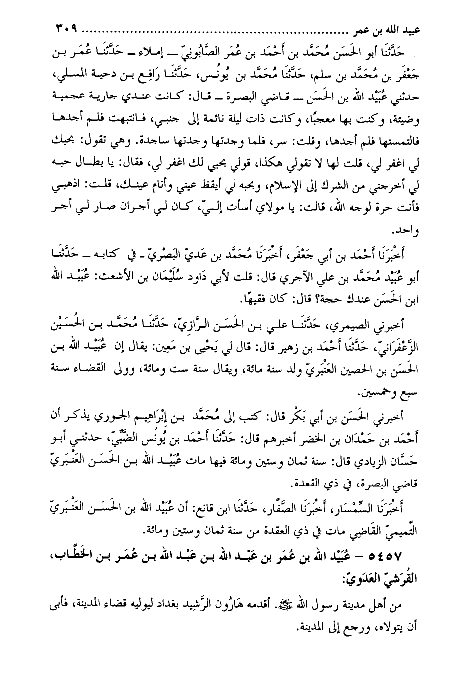 5457 عبيد الله بن عمر بْن عَبْد اللَّهِ بْن عَبْد اللَّهِ بْن عُمَر بْن الخطاب، القرشي العدوي: