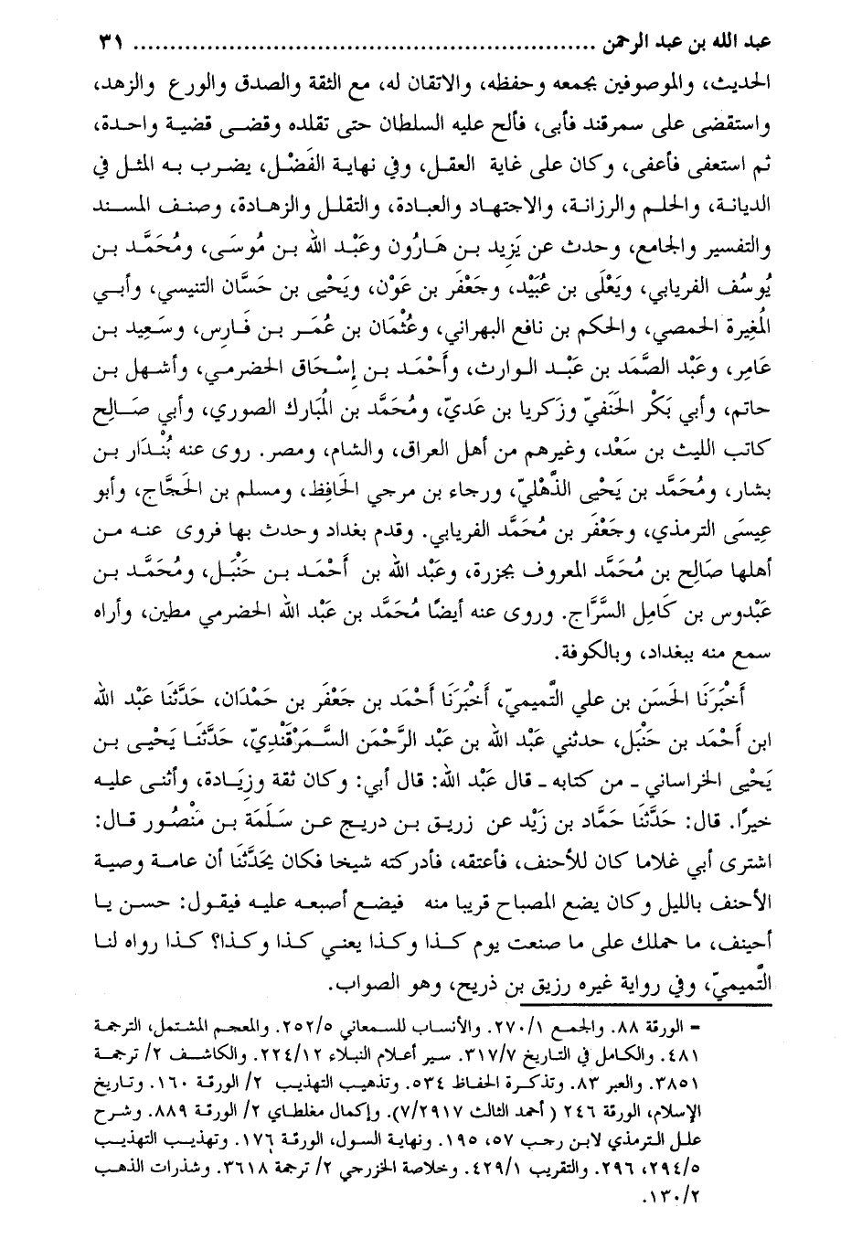 أخبرنا الحسن بن علي التّميميّ، أخبرنا أحمد بن جعفر بن حمدان، حَدَّثَنَا عبد الله ابن أحمد بن حنبل، حَدَّثَنِي عبد اللَّه بن عبد الرحمن السمرقندي، حدّثنا يَحْيَى بن يَحْيَى الخراساني- من كتابه- قَالَ عبد اللَّه: قَالَ أَبِي: وكان ثقة وزيادة، وأثنى عليه خيرًا. قَالَ: حَدَّثَنَا حماد بن زيد عن زريق بن دريج عن سلمة بن منصور قَالَ: