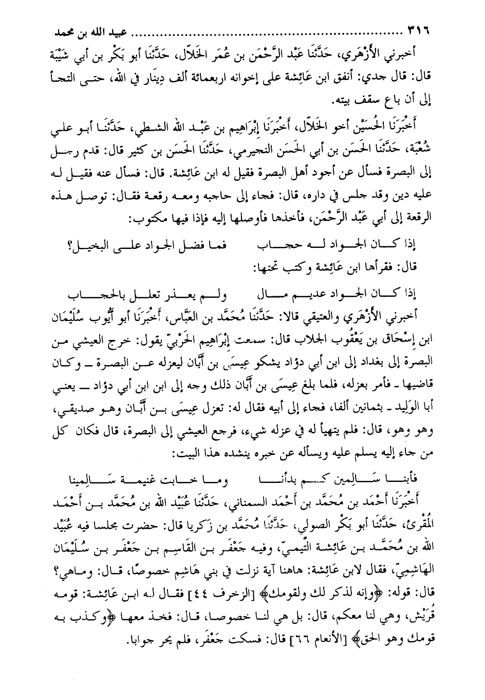 أَخْبَرَنَا أَحْمَد بْن مُحَمَّد بْن أَحْمَد السمناني، حَدَّثَنَا عُبَيْد الله بْن مُحَمَّد بْن أَحْمَد المقرئ، حدّثنا أبو بكر الصولي، حَدَّثَنَا محمد بن زكريا قال: حضرت مجلسا فيه عُبَيْدُ اللَّهِ بْنُ مُحَمَّدِ بْنِ عَائِشَةَ التَّيْمِيُّ، وفيه جعفر بن القاسم بن جعفر بن سليمان الهاشمي، فقال لابن عائشة: هاهنا آية نزلت في بني هاشم خصوصا، قال: وما هي؟