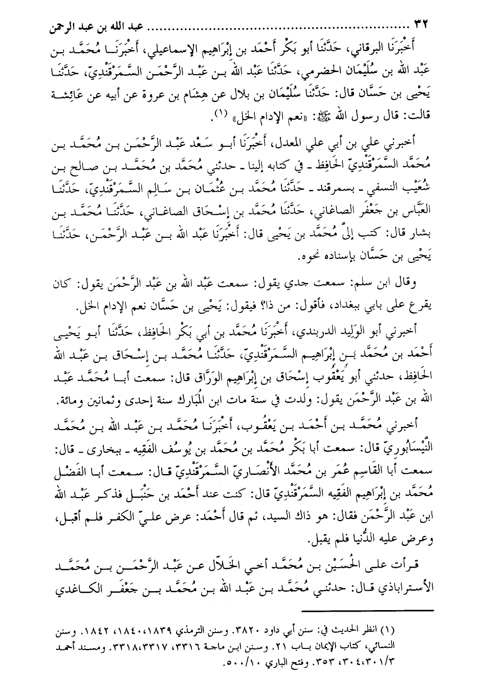 . أخبرني علي بن أبي علي المعدل، أَخْبَرَنَا أبو سعد عبد الرحمن بن محمد بن محمد السمرقندي الحافظ- في كتابه إلينا- حدثني مُحمد بْنُ مُحَمَّدِ بْنِ صَالِحِ بْنِ شعيب النسفي- بسمرقند- حَدَّثَنَا مُحَمَّدُ بْنُ عُثْمَانَ بْنِ سَالِمٍ السَّمَرْقَنْدِيُّ، حدّثنا العبّاس بن جعفر الصاغاني، حدّثنا محمّد بن إسحاق الصاغاني، حَدَّثَنَا مُحَمَّدُ بْنُ بَشَّارٍ قَالَ: كَتَبَ إِلَيَّ مُحَمَّدُ بْنُ يَحْيَى قَالَ: أَخْبَرَنَا عَبْدُ اللَّهِ بن عبد الرّحمن، حدّثنا يَحْيَى بْنُ حَسَّانَ بِإِسْنَادِهِ نَحْوَهُ.