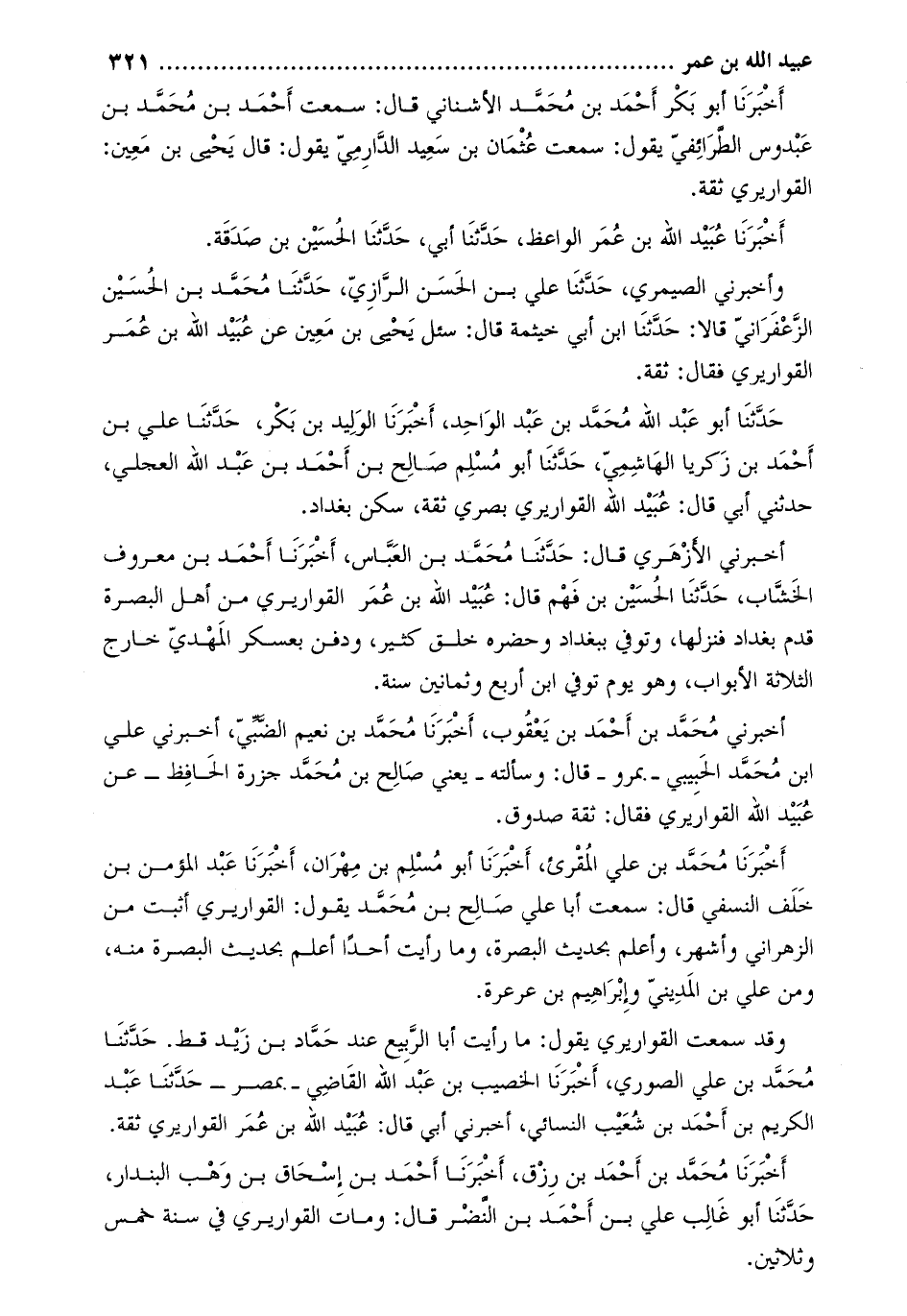 وأخبرني الصيمري، حدّثنا علي بن الحسن الرّازيّ، حَدَّثَنَا مُحَمَّد بن الحُسَيْن الزَّعْفَرَانِيّ قَالا: حَدَّثَنَا ابن أبي خيثمة قَالَ: سئل يحيى بن معين عن عبيد الله بن عمر القواريري فقال: ثقة.