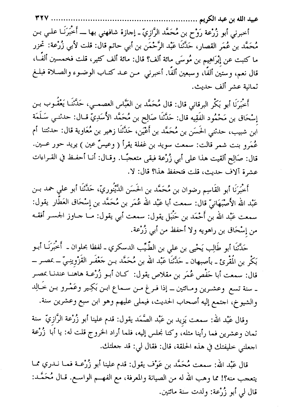 حَدَّثَنَا أَبُو طَالِبٍ يَحْيَى بْنُ عَلِيِّ بْنِ الطيب الدَّسْكَرِيُّ- لَفْظًا بِحُلْوَانَ- أَخْبَرَنَا أَبُو بَكْرِ بْنُ المقرئ- بأصبهان- حَدَّثَنَا عَبْد اللَّه بْن مُحَمَّد بْن جعفر القزويني- بمصر- قال: سمعت أبا حفص عمر بن مقلاص يقول: كان أبو زرعة هاهنا عندنا بمصر- سنة تسع وعشرين ومائتين- إذا فرغ من سماع ابن بكير وعمرو بن خالد والشيوخ، اجتمع إليه أصحاب الحديث، فيملي عليهم وهو ابن سبع وعشرين سنة.
