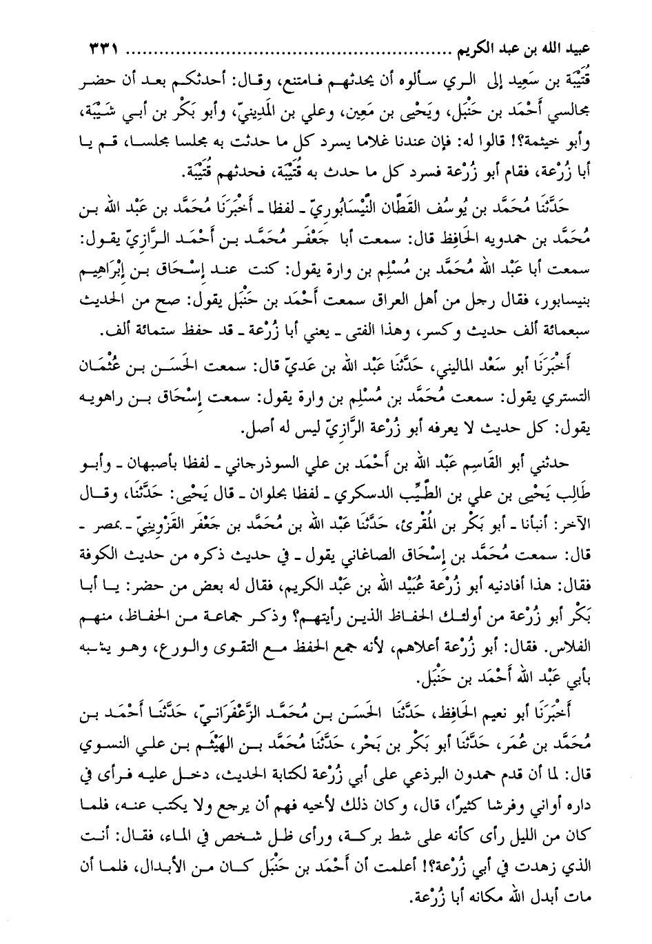 حَدَّثَنِي أَبُو الْقَاسِمِ عَبْدُ اللَّهِ بْنُ أَحْمَدَ بْنِ علي السوذرجاني- لفظا بِأَصْبَهَانَ- وأَبُو طَالِبٍ يَحْيَى بْنُ عَلِيِّ بْنِ الطَّيِّبِ الدَّسْكَرِيُّ- لفظا بحلوان- قال يحيى: حدّثنا، وقال الآخر: أنبأنا- أبو بكر بن المقرئ، حَدَّثَنَا عَبْد اللَّه بْن مُحَمَّد بْن جعفر القزويني- بمصر- قال: سمعت محمد بن إسحاق الصاغاني يقول- في حديث ذكره من حديث الكوفة فقال: هذا أفادنيه أَبُو زُرْعَةَ عُبَيْدِ اللَّهِ بْنُ عَبْدِ الْكَرِيمِ، فقال له بعض من حضر: يا أبا بكر أبو زرعة من أولئك الحفاظ الذين رأيتهم؟ وذكر جماعة من الحفاظ، منهم الفلاس. فقال: أبو زرعة أعلاهم، لأنه جمع الحفظ مع التقوى والورع، وهو يشبه بأبي عَبْد اللَّه أَحْمَد بْن حَنْبَل.