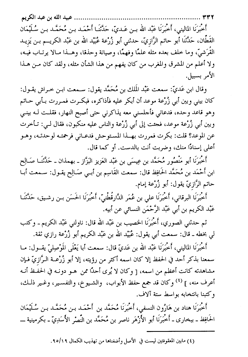 أخبرنا الماليني، أخبرنا عبد الله بن عديّ، حَدَّثَنَا أحمد بن محمد بن سليمان القطان، حدّثنا أبو حاتم الرّازيّ، حَدَّثَنِي أَبُو زُرْعَةَ عُبَيْدِ اللَّهِ بْنُ عَبْدِ الْكَرِيمِ بن يزيد القرشي، وما خلف بعده مثله علما وفهما، وصيانة وحذقا، وهذا ما لا يرتاب فيه، ولا أعلم من المشرق والمغرب من كان يفهم من هذا الشأن مثله، ولقد كان من هذا الأمر بسبيل.