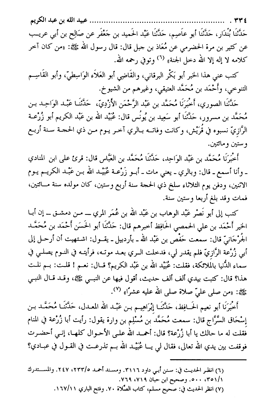 كَتَبَ إِلَيَّ أَبُو نَصْرٍ عَبْدُ الْوَهَّابِ بْنُ عَبْدِ اللَّهِ بْنِ عُمَرَ الْمُرِّيُّ- مِنْ دِمَشْقَ- أَنَّ أَبَا الْخَيْرِ أَحْمَدَ بْنَ عَلِيٍّ الْحِمْصِيَّ الْحَافِظَ أَخْبَرَهُمْ قَالَ: حَدَّثَنَا أَبُو الْحَسَنِ أَحْمَدُ بْنُ مُحَمَّدِ الْجُرْجَانِيُّ قَالَ: سَمِعْتُ حَفْصَ بْنَ عَبْدِ اللَّهِ- بِأَرْدَبِيلَ- يَقُولُ: اشْتَهَيْتُ أَنْ أَرْحَلَ إِلَى أَبِي زُرْعَةَ الرَّازِيِّ فَلَمْ يُقَدَّرْ لِي، فَدَخَلْتُ الرَّيَّ بَعْدَ مَوْتِهِ، فَرَأَيْتُهُ فِي النَّوْمِ يُصَلِّي فِي سَمَاءِ الدُّنْيَا بِالْمَلائِكَةِ، فَقُلْتُ: عُبَيْدُ اللَّهِ بْنُ عَبْدِ الْكَرِيمِ؟ قَالَ: نَعَمْ! قُلْتُ: بِمَ نِلْتَ هَذَا؟ قَالَ: كَتَبْتُ بِيَدِي أَلْفَ أَلْفِ حَدِيثٍ، أَقُولُ فِيهَا عَنِ النَّبِيِّ صَلَّى اللَّهُ عَلَيْهِ وَسَلَّمَ، وَقَدْ قَالَ النَّبِيُّ صَلَّى اللَّهُ عَلَيْهِ وَسَلَّمَ: «مَنْ صَلَّى عَلَيَّ صَلاةً صَلَّى اللَّهُ عَلَيْهِ عَشْرًا» [2] .