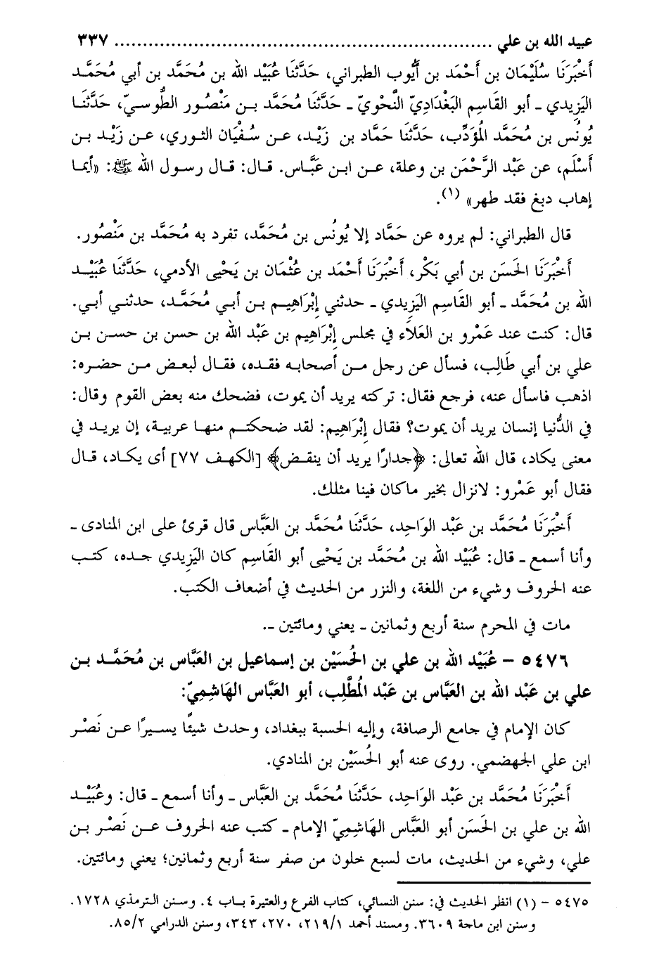5476- عُبَيْد اللَّه بْنِ عَلِيّ بْن الْحُسَيْن بْن إِسْمَاعِيل بْن الْعَبَّاس بْن مُحَمَّد بْن عليّ بْن عَبْد اللَّه بن العباس بن عبد المطلب، أبو العباس الهاشمي: