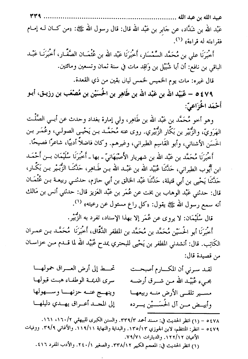 5479 عبيد اللَّه بْن عَبْد اللَّهِ بْن طاهر بْن الحسين بن مصعب بن رزيق، أبو أحمد الخزاعي [2] :